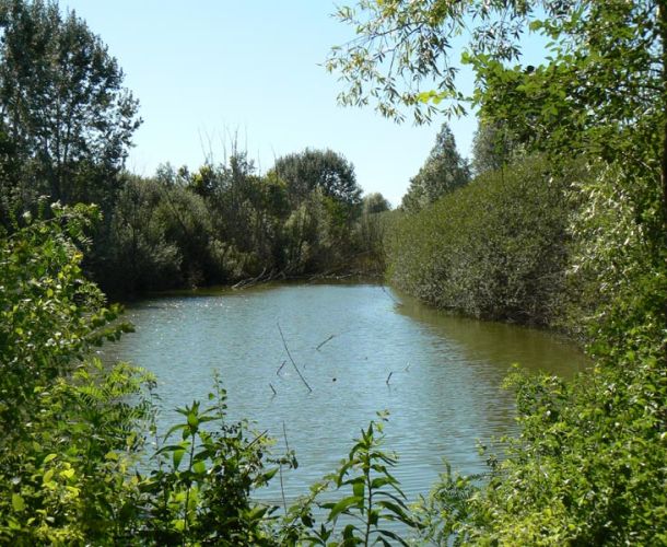 Lanca abbandonata con passerelle su palafitte, 4 capanni per il birdwatching e percorso sensoriale accessibile; totem d…
